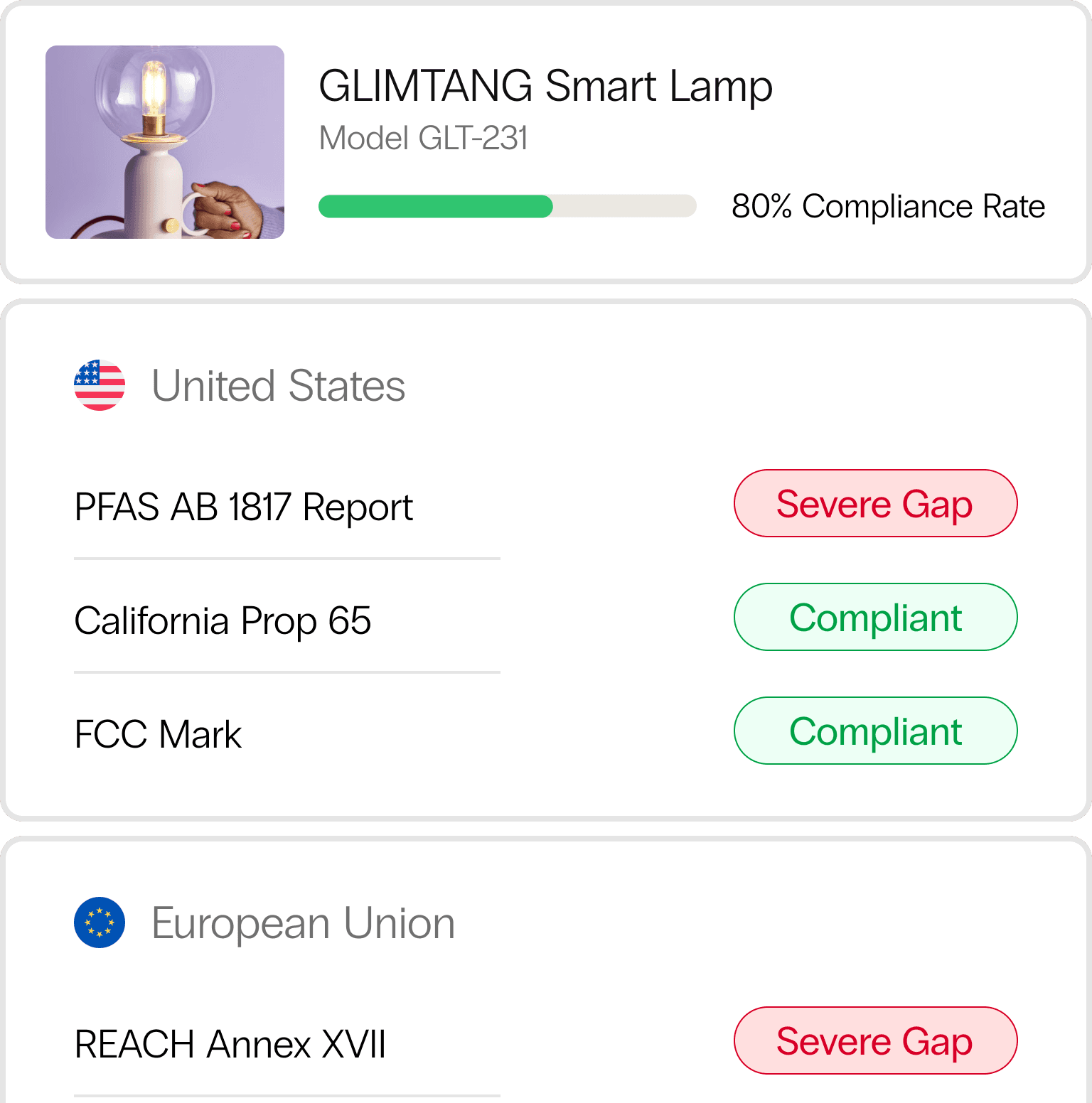 Stop flying blind & ignoring liability risks. Sell with confidence that every SKU meets every regulations that applies across your markets.